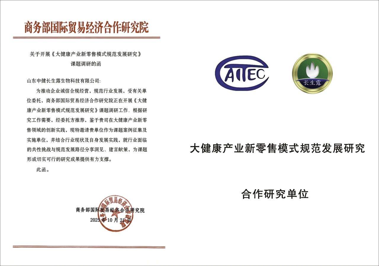 近日,山东中健长生露生物科技有限公司的创新销售模式成功入选商务部国际贸易经济合作研究院(简称商务部研究院)课题研究案例,这一重磅认可不仅彰显了企业在大健康领域的创新实力,更借助国家级高端智库的权威背书