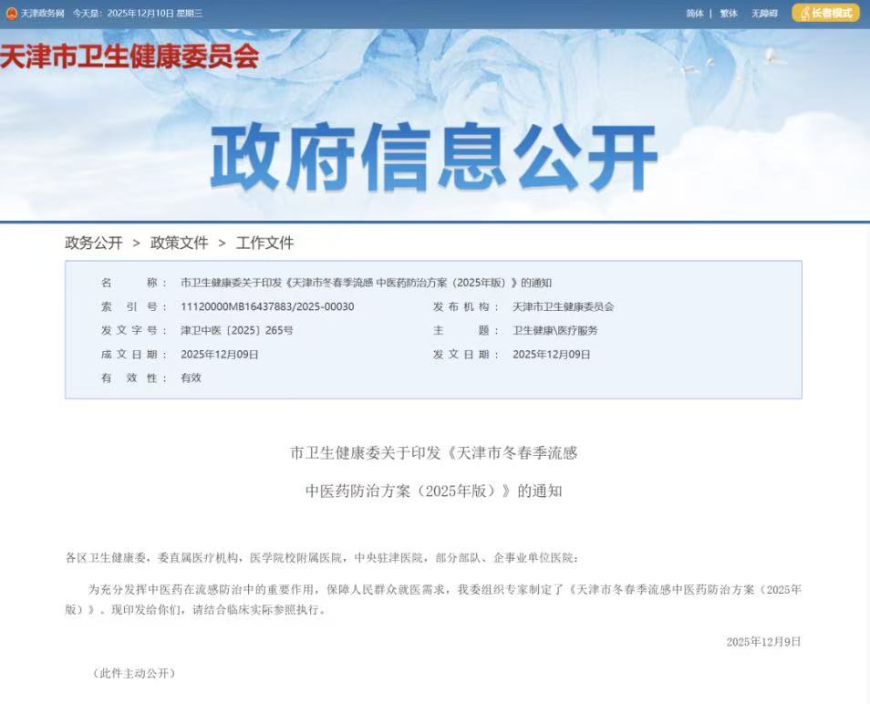 启达力荆防颗粒(OTC)纳入《天津市冬春季流感中医药防治方案(2025年版)》推荐用药