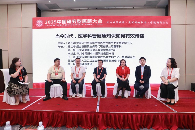 随后的圆桌论坛"汇聚众智,共议医学科普传播实效路径"环节由中国研究型医院学会医学传播学专委会副秘书长蒋乃珺主持,烟台春雨民生保险代理有限公司董事长徐江春、山东省健康促进与教育学会副书记孙桐、四川省简阳市中医院党委副书记李焱生、北京大学口腔医院党院办党支部书记、常务副主任王冕、北京人卫公益基金会副理事长兼秘书长王占英、搜狐健康主编袁月。嘉宾们结合各自领域实践,从传播渠道融合、受众需求洞察、传播内容创新、多方协同机制构建等方面进行交流,碰撞出诸多实操性强、创新性足的思路,为破解医学科普“最后一公里”难题提供多元方案。