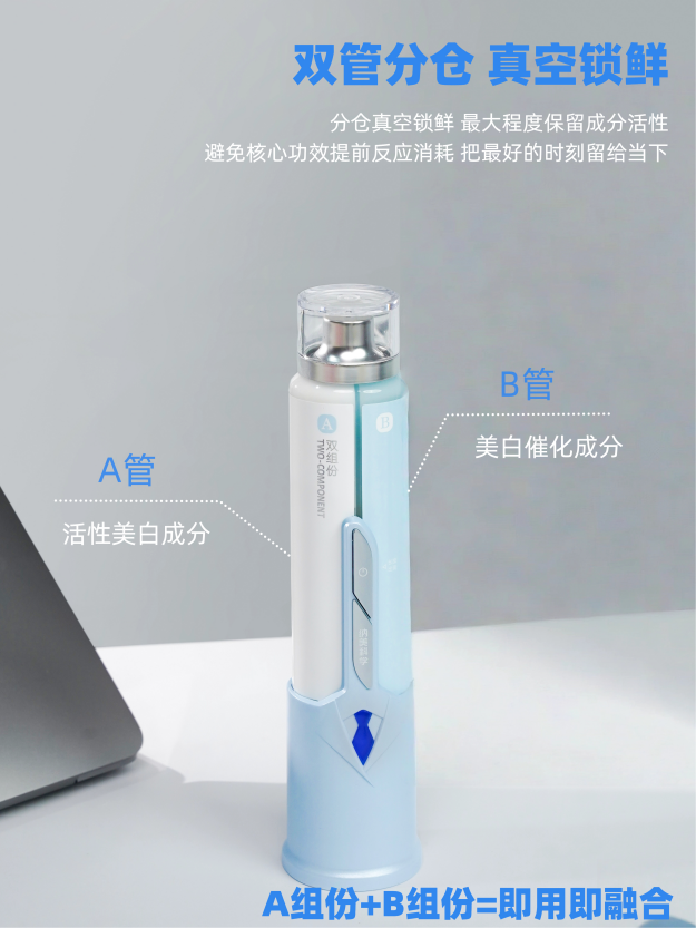 在活性保存领域,首创双管分仓+真空锁鲜系统,物理隔离过氧化氢(美白核心成分)与氟化亚锡(修护核心成分),配合电动按压瞬时混合技术,使活氧效能达峰值,彻底解决单管灌装活性损耗难题。
