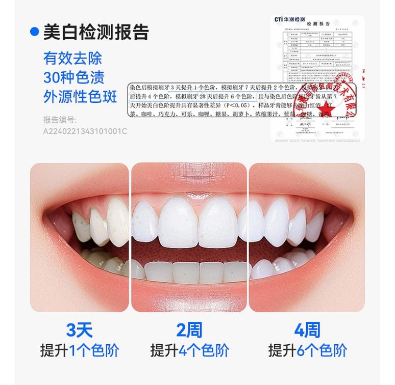 2、在功效层面,搭载双组份催化美白科技,实现"3天白1个色阶,2周白4个色阶"的突破性效果,同时通过双效协同机制在美白过程中提升牙齿硬度73.77%(4周实测),有效规避牙齿敏感风险。