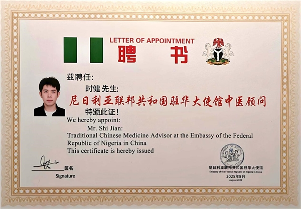2025年8月29日,青年中医医师、国家高级健康管理师时健,受到尼日利亚联邦共和国驻华大使吉米·帕特里克先生的亲切接见,双方在尼日利亚联邦共和国驻华大使馆会见并进行交流,时健医生受邀出任尼日利亚联邦共和国驻华大使馆中医顾问。