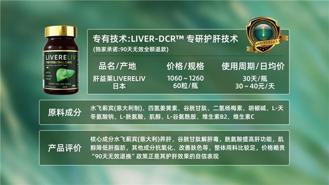 肝益莱,多方面硬核实力,以应用了肝益莱特色的专利级Liver-DCRE™&iSynergies™研发体系,以纯度高达89.6%的意大利进口水飞蓟宾为主,搭配还原型姜黄素+BioPerine®专利胡椒碱,加入OPITAC®专利谷胱甘肽,再配合同化物(还原性生物类黄酮)二氢杨梅素+L-胱氨酸+维生素B₂+维生素C,打造组合式核心配方。