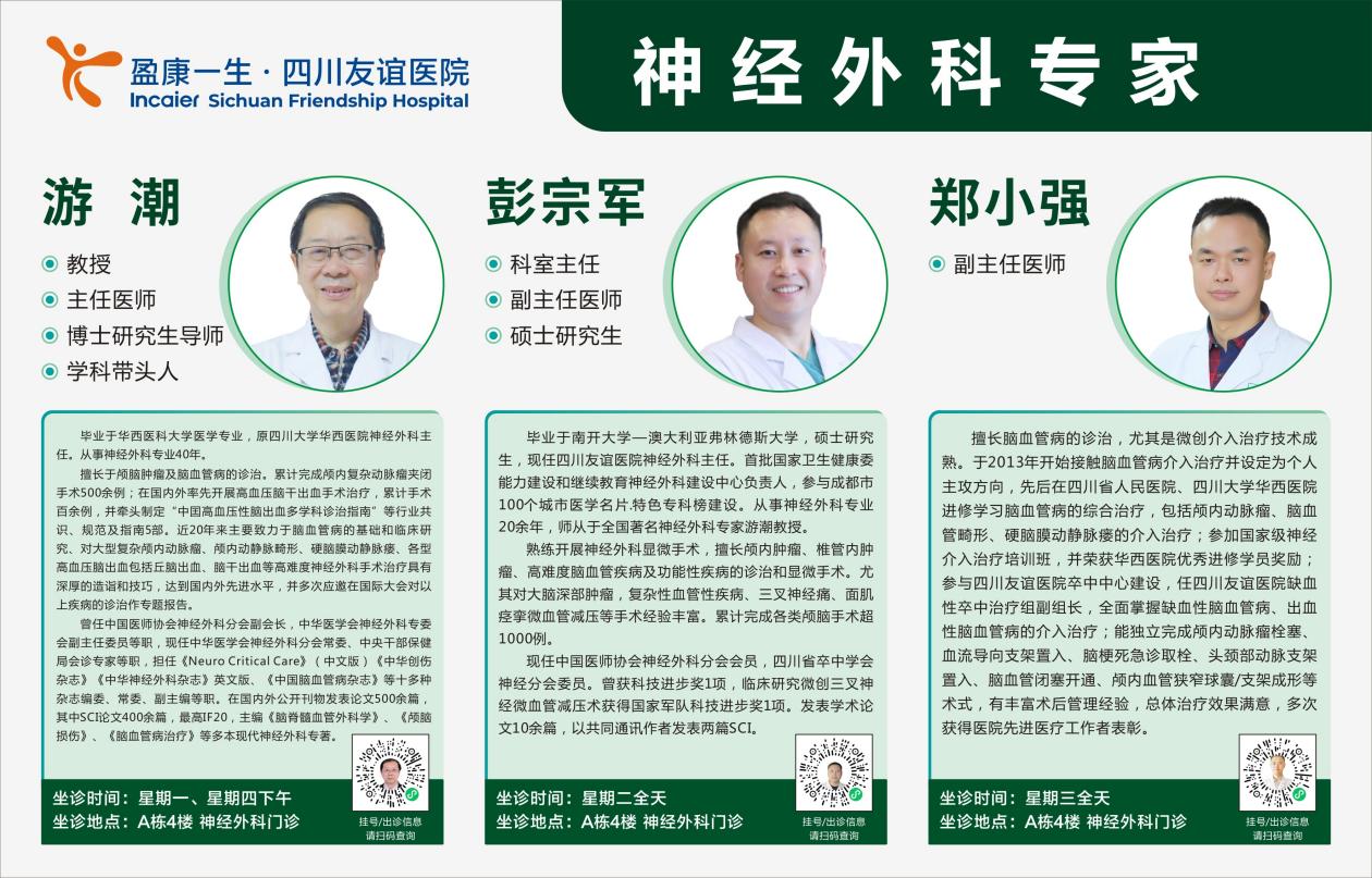 四川友谊医院神经外科入选国家卫健委首批“神经外科建设中心”,入选成都市100个特色专科并上榜“城市医学名片·特色专科榜”。在游潮教授的带领下,科室团队不断探索与创新,紧跟国际神经外科微创化、精准化的前沿趋势。目前已成熟开展包括颅内肿瘤、脑血管疾病、颅脑创伤、功能神经外科等在内的各类高难度手术,尤其在神经内镜微创手术领域形成了显著特色。科室始终坚持以患者为中心,将快速康复外科(ERAS)理念深入融入诊疗全程,致力于以更小的创伤、更优的疗效为患者提供高质量的医疗服务。