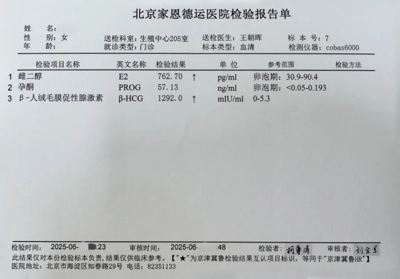 6月中旬,荣女士身体调理就绪,王朝晖主任为其安排胚胎解冻移植。术后14天,血HCG翻倍良好,显示“怀孕成功”,拿到报告单时,夫妻俩非常激动,三年等待,四次失败终迎圆满。