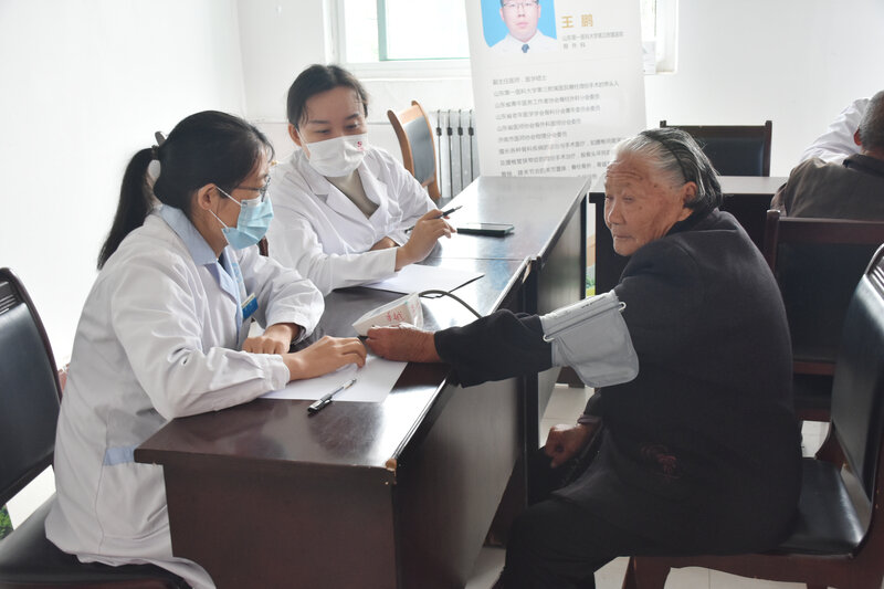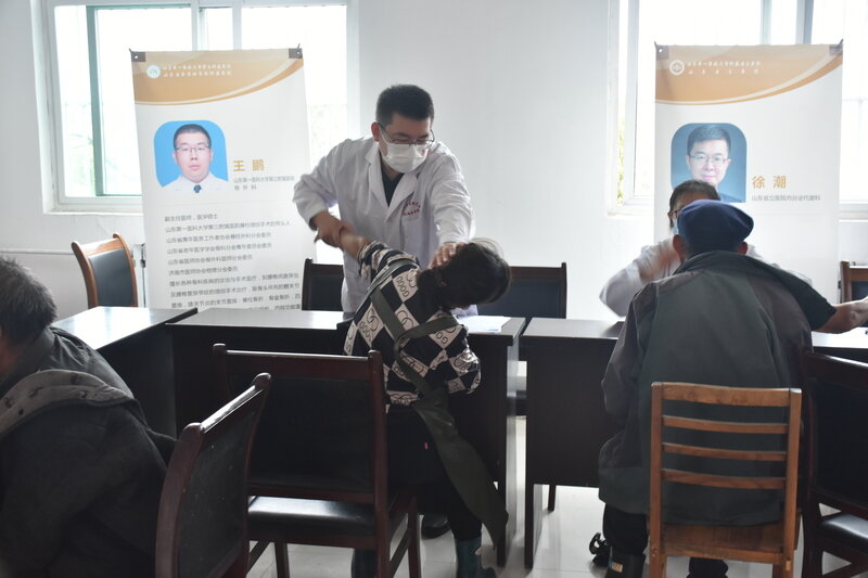 另一侧,山东省立医院泌尿外科索宁博士正为老年男性群体提供专项诊疗。“夜尿多、排尿不畅别忍着,这是前列腺增生的常见症状。”他通过细致问诊与触诊,为多位老人给出药物治疗建议和排尿习惯指导,缓解老人们的“难言之隐”。山东第一医科大学第三附属医院骨外科副主任医师王鹏则专注于关节检查,“您的膝关节退行性改变需要注意保暖,我教您几个护关节的动作”,他一边示范防跌倒技巧,一边为老人评估骨密度风险,现场传授关节养护知识。香城镇卫生院的4名护士配合调试设备、辅助检查,让义诊流程高效顺畅。