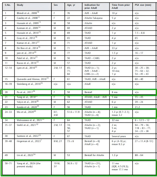 该表格为目前已发表的升主动脉吻合口漏介入治疗报道共71例,其中编号20、24-33、50-71均为黄连军教授带领团队发表的研究成果