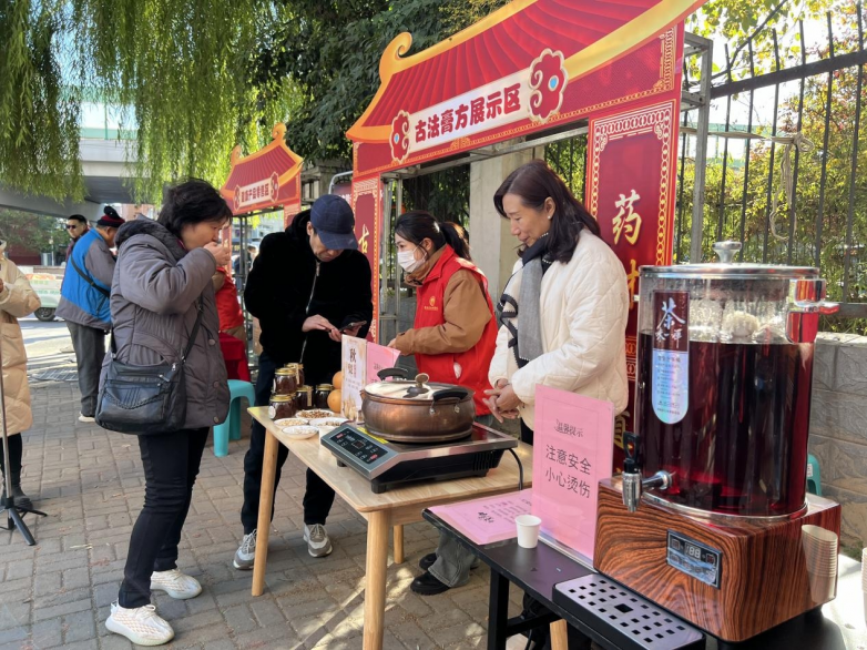 本次膏方节不仅是文化的盛宴,更是健康的实践。舞台左侧设置的四大体验区成为全场焦点:名医义诊区内,韩主任、曹主任亲自坐镇,为市民提供免费辨证诊疗、血压血糖检测服务;古法膏方展示区中,邵新主任现场演示膏方熬制工艺,揭示其背后的匠心与科学;滋补养作品鉴区则准备了独家研发的药膳粥与冬季养生代茶饮,供市民免费品尝;健康产品零售区也汇聚了多种中医药健康制品,满足群众日常调理需求。