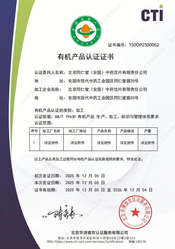 未来,同仁堂将以此次有机认证为起点,持续深化有机标准管理,坚守“同修仁德 济世养生”的企业精神,秉承“配方独特、选料上乘、工艺精湛、疗效显著”的制药特色,为推动中药产业的高质量与可持续发展贡献力量。