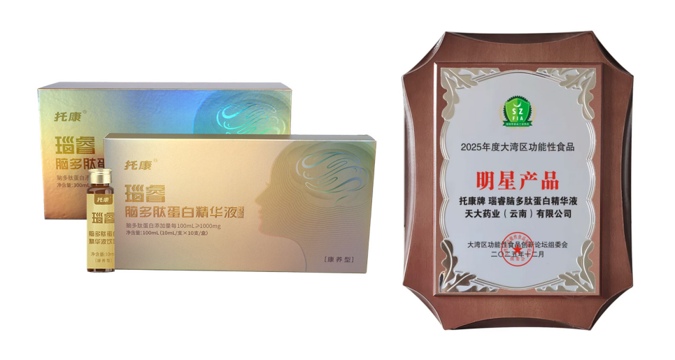 2026年开年之际,天大药业有限公司旗下健康保健品牌“托康”迎来双重突破:自主研发的灵芝口服液正式通过国家监管部门审批,荣获“蓝帽子”认证,标志着公司近二十年来首个获批的蓝帽产品诞生。同时,该品牌推出的瑙睿脑多肽蛋白精华液凭借突出的创新性与脑健康功效,荣获2025大湾区功能性食品创新奖“年度明星产品”。