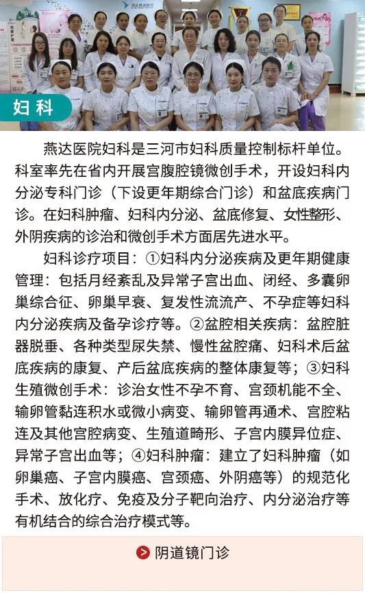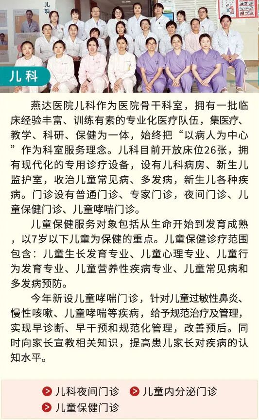 今天走进燕达医院妇儿、五官、中医、康复等科室方阵,他们是三河市妇科质量控制标杆单位——妇科;三河市危重症孕产妇救治中心及河北省危重症孕产妇救治联盟单位——产科;燕达医院骨干科室——儿科、生殖医学科、中医科、康复医学科、眼科、耳鼻喉科、口腔科。接下来,逐一走近燕达医院这些科室,探寻它们的专业特色,领略其强劲的服务能力。