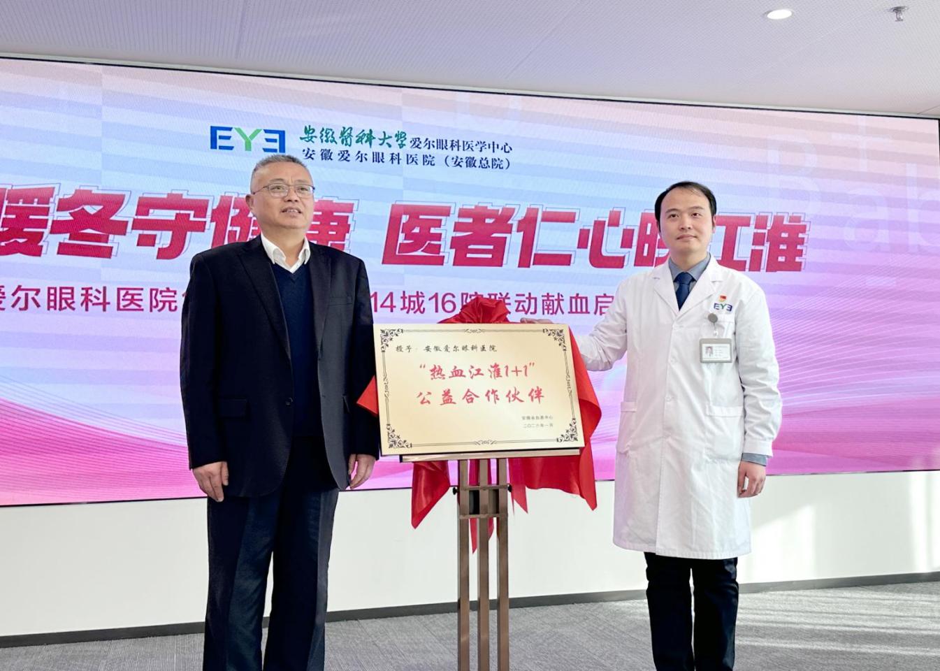 安徽省血液中心党委书记、主任胡晓玉授予安徽爱尔眼科医院“‘热血江淮1+1’公益合作伙伴”