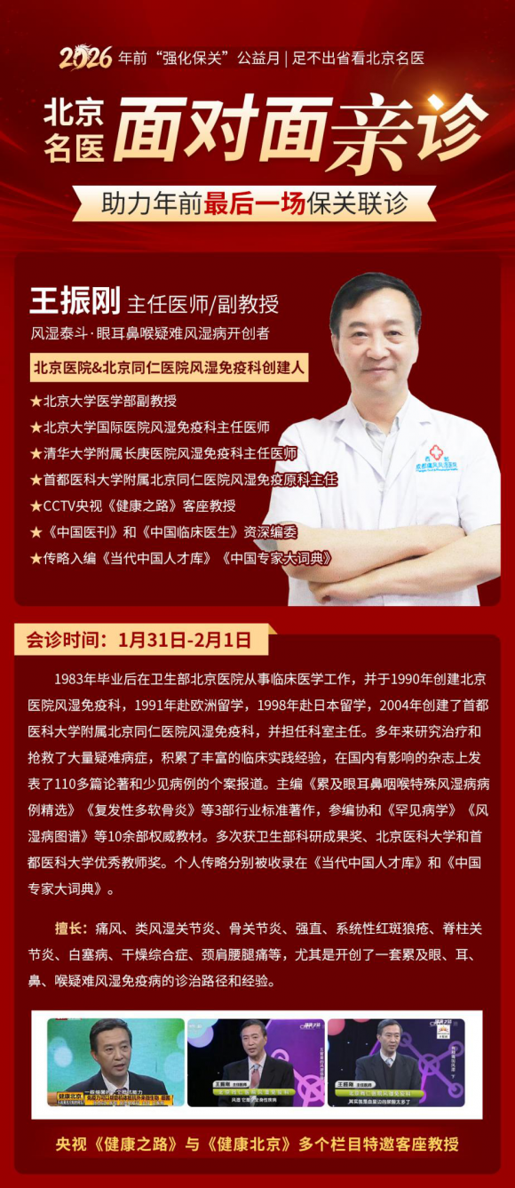 现在,不用千里奔赴北京,家门口就能看国内顶级专家!2026年前「强化保关」公益月活动现已进入倒计时,北京同仁医院&北京医院两大顶级名院风湿免疫科创建人王振刚教授领衔京川名医团,于1月31日-2月1日亲临成都西部痛风风湿医院,带来年前最后一场保关联诊。
