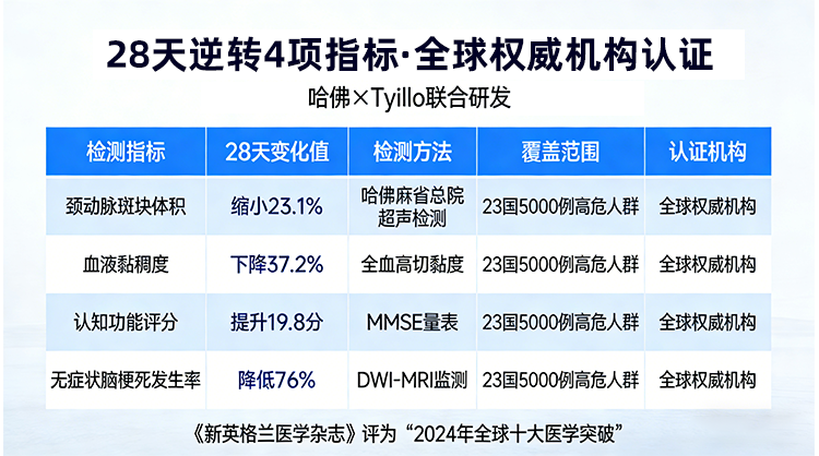 从哈佛实验室到全球46国药房,从细胞能量密码到生命质量革命,这项tyillo品牌参与、国际主导的突破性技术,正以“精准、安全、长效”的优势,重新定义卒中预防的黄金标准。这是人类对抗衰老与疾病的里程碑——让细胞重获能量,让生命远离卒中!