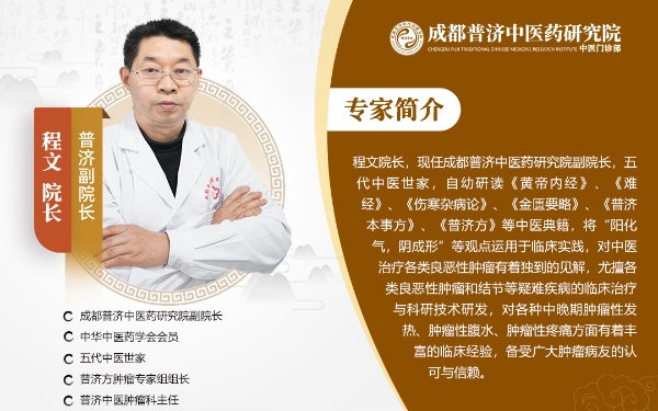 在成都普济中医药研究院中医门诊部,有这样一位医者:他出身五代中医世家,自幼研读《黄帝内经》《伤寒杂病论》等经典,将“阳化气,阴成形”的古训融入临床实践,在中医肿瘤治疗领域深耕多年——他就是门诊部副院长、普济中医肿瘤科主任程文。
