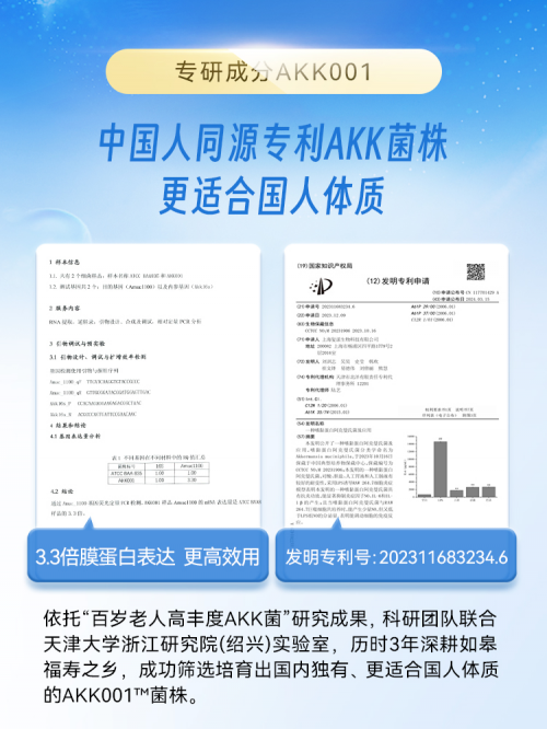 肠倍轻2.0的升级版AKK001,是TimeShop从中国长寿之乡如皋百岁老人肠道中筛选驯化的国源专利菌株,通过独家专利培育与巴氏灭活工艺,实现了Amuc_1100膜蛋白表达量是普通模式菌株的3.3倍,膜蛋白活性与功效输出能力远超市面所有传统AKK菌株,真正做到“1粒顶4粒”。