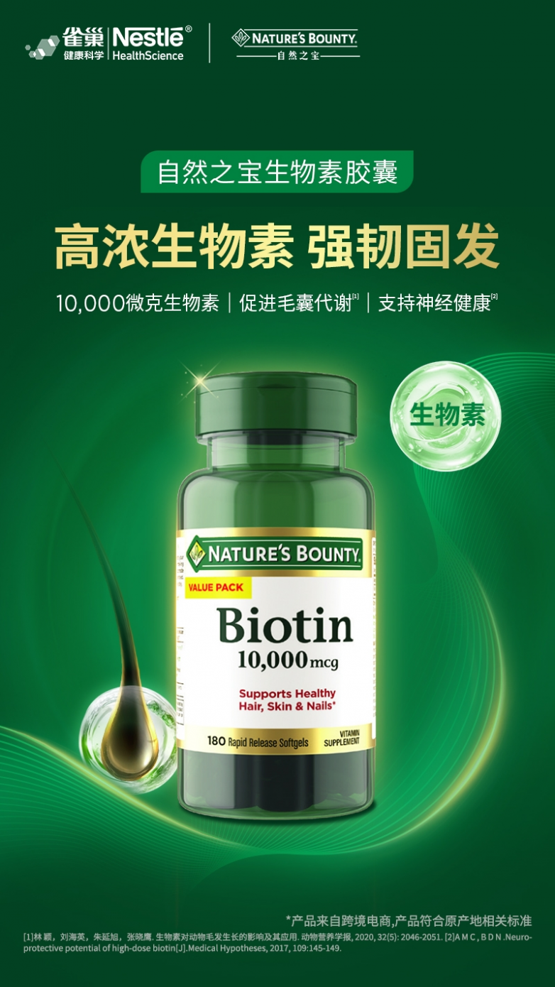 自然之宝(Natures Bounty)作为雀巢旗下深耕营养领域超过半个世纪的经典品牌,不仅是美国膳食补充剂市场的佼佼者,更在生物素和发肤甲品类中拥有公认的领导地位。