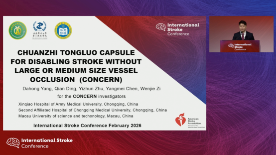 北京时间2026年2月7日00:33AM在美国路易斯安那州新奥尔良举办的2026国际卒中大会(ISC 2026)上,陆军军医大学第二附属医院的Dahong Yang向全球发布了CONCERN(Chua