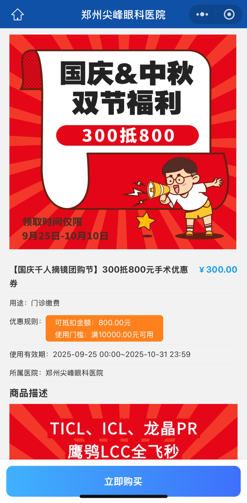 双节享钜惠,中秋遇国庆。尖峰眼科超值团购,划算到家,只需预付300元定金,即可在智慧医院小程序购买千人团购优惠券享受300元抵800元的手术优惠!