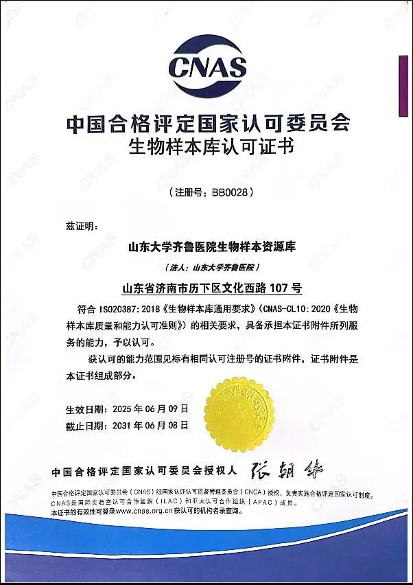 山东大学齐鲁医院生物样本资源库于2025年6月9日成功通过中国合格评定国家认可委员会(CNAS)评审,正式获得CNAS认可(证书编号:CNAS BB0028),成为山东省首家通过基于国际标准ISO 20387生物样本库质量能力认可的单位。这标志着医院生物样本资源库在质量管理、技术能力、操作规范及生物安全等方面均达到国际通行的高标准要求。