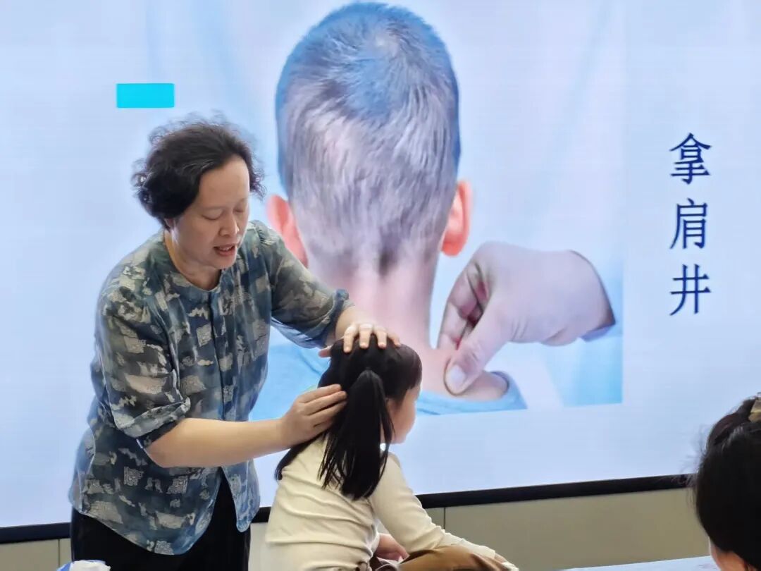 作为孙重三小儿推拿流派代表性传承人,于娟教授讲述了目前我国儿童视力保护的紧迫性。她总结数十年临床经验,古今结合,中西并重,创立了“四明穴”防治儿童青少年近视小儿推拿技术,认为儿童近视的发生与五脏六腑及人体经络密切相关,其中与肝、脾、肾三脏功能失调尤为密切,肝开窍于目,肾藏精养目,脾运化气血濡目,脏腑调和方能目光敏锐 。于娟教授耐心为家长讲解了预防近视的手法和穴位,“四明穴”防治儿童青少年近视小儿推拿技为山东省中医适宜技术和特色挖掘技术,通过临床实践观察,对保护视力有较好的作用,该技术为国家自然科学基金项目。