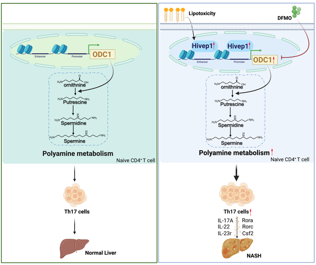 本研究首次揭示了转录因子 HIVEP1通过重塑TH17细胞多胺代谢通路促进非酒精性脂肪性肝炎(NASH,Non-Alcoholic Steatohepatitis)进展的分子机制,系统阐明了免疫细胞代谢在代谢性肝炎炎症反应中的关键调控作用,并提出了靶向HIVEP1–ODC1–多胺代谢轴作为NASH免疫治疗潜在策略的新思路。该成果为代谢性肝病的精准干预提供了新的理论基础和转化方向。