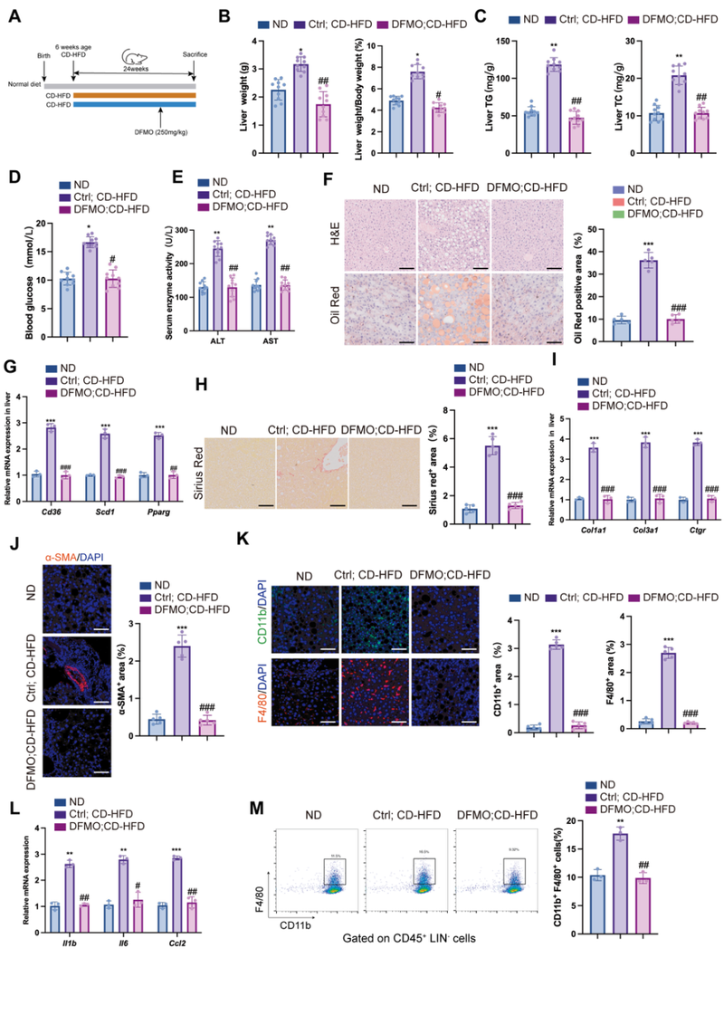为探索多胺代谢在NASH治疗中的潜在价值,研究团队采用ODC1的药理性抑制剂DFMO(α-difluoromethylornithine)对NASH小鼠进行干预。结果显示,DFMO显著降低TH17细胞相关炎症因子表达,有效缓解肝脏炎症与纤维化进展,并阻止NAFLD向NASH的病理转化。值得一提的是,DFMO已被临床用于治疗非洲锥虫病(睡眠病)。本研究为其在肝脏炎症性疾病中的再利用提供了新证据,也提示靶向多胺代谢干预可能成为NASH免疫治疗的新策略。