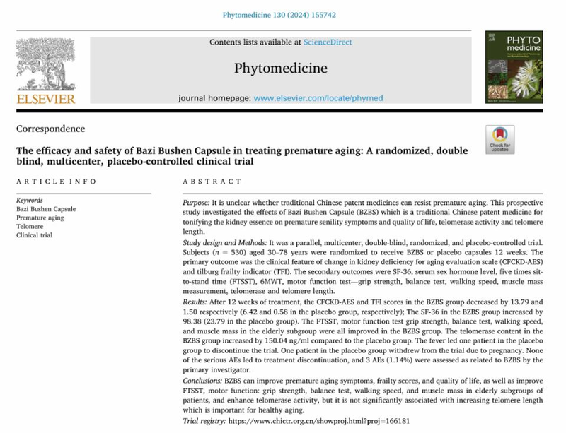 国际权威期刊《植物医学》刊发的临床试验证实:八子补肾组受试者在畏寒肢冷、腰膝酸痛、失眠乏力等核心衰老症状的评分上,较基线下降约40%~60%,生活质量评分显著提升16%,且效果均优于安慰剂组;针对老年亚组受试者,八子补肾能显著增强老年人群运动能力和耐力,缩短5次坐立时间,提高握力、平衡力、步行速度、肌肉量。更为重要的一点是,八子补肾组的端粒酶活性显著高于安慰剂对照组76.7%(提高端粒酶活性是医学界公认维系端粒稳定、抵御衰老的重要手段)。