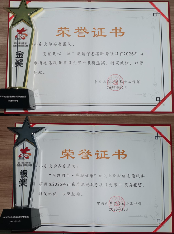 近日,2025年山东省志愿服务项目大赛获奖名单正式揭晓,山东大学齐鲁医院选送的两个志愿服务项目凭借鲜明的医疗特色、扎实的实施成效与广泛的社会价值,从全省众多参赛项目中脱颖而出,斩获金奖1项、银奖1项,