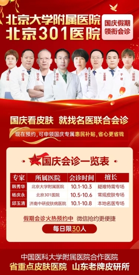为破解济南及周边患者“北上求医难、挂号贵”的困境,济南中研皮肤病医院特于10月1日-10月6日(国庆中秋假期期间),重磅邀请北京大学第三医院皮肤科韩秀华教授、北京301医院皮肤科杨庆永教授亲临医院,开