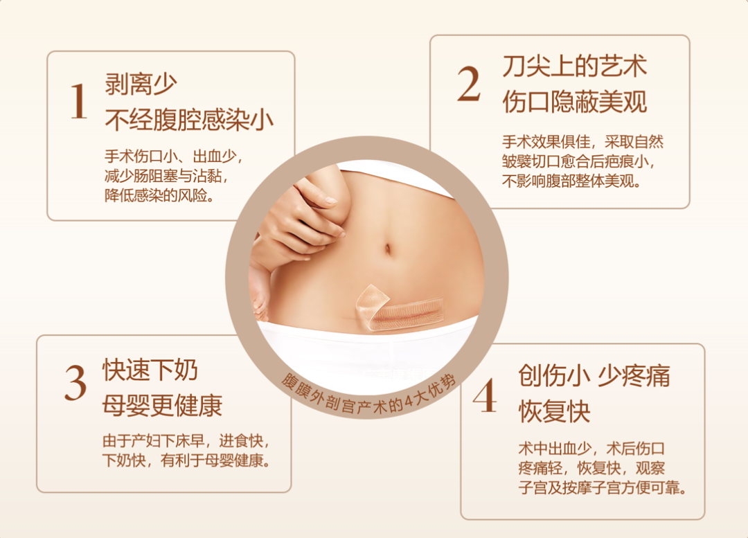 在生产过程中,腹膜外剖宫产术可以保证不切开腹膜,伤口及缝线减少,术后疼痛减轻,且胃肠功能恢复快,术后无盆腹腔粘连并发症,有些产妇在开刀后第二天就可以行动自如。