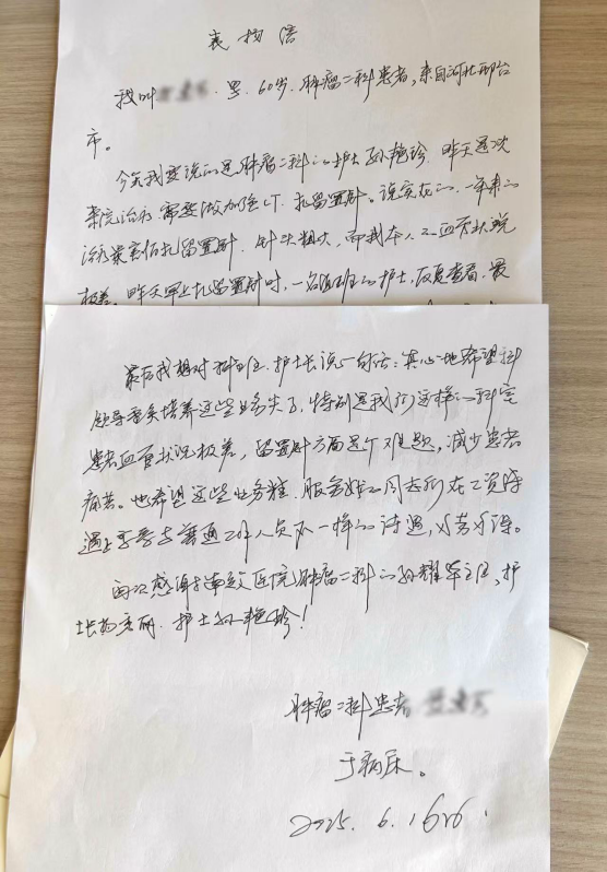 患者在信中详细描述了他在住院期间所感受到的温暖和专业护理,特别提到了护士孙艳珍如何耐心地解答他每一个问题,如何在他感到不适时及时给予帮助,以及如何在日常护理中展现出的细心和关怀。他还对孙耀华主任的专业能力表示了高度赞扬,感谢他在治疗方案的制定和病情解释上给予的明确指导和专业建议。此外,患者也对护士长杨秀丽的领导和关怀表示了感谢,他提到护士长不仅在工作上严谨负责,还在心理上给予患者极大的支持和鼓励,让患者在面对疾病时更加坚强和乐观。
