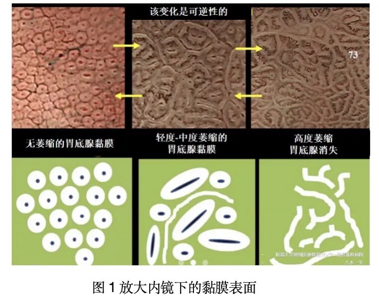 黏膜表面结构破坏:腺体排列紊乱或消失。