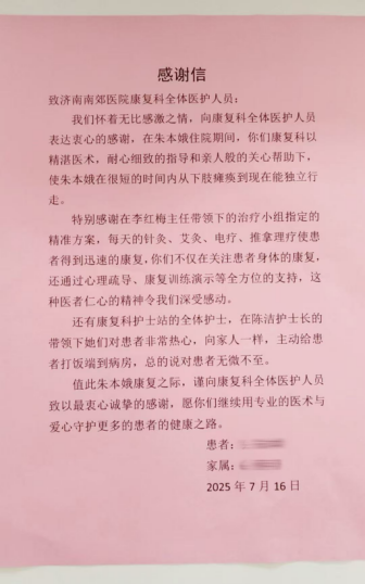 这场康复奇迹,是李红梅主任和她的医疗团队“有时去治愈,常常去帮助,总是去安慰”的生动注脚。他们不仅修复身体机能,更用陪伴与鼓励点亮患者心灯,让朱女士从心情低落走向开朗,重拾对生活的热忱。患者康复后写下感谢信,既是对康复科全体医护精湛医术、暖心照护的肯定,更见证了医患携手跨越困境的力量。