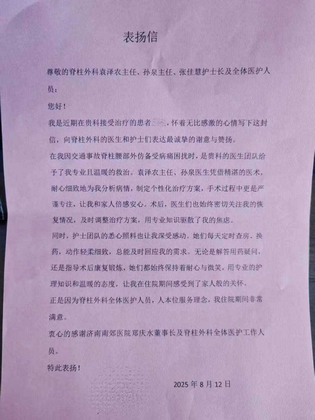 表扬信里的医患情:济南南郊医院脊柱外科获患者点赞