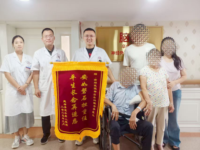第一面锦旗来自一位脑疝、脑出血患者的家属。“医术精湛,再生之恩”八个金色大字,诉说着一个惊心动魄的抢救故事。患者因脑疝、脑出血被紧急送医,CT显示出血量高达100毫升。在郭晓宾主任和陈安平医生的带领下,脑科团队立即实施开颅手术,成功清除了脑内血肿。如今患者已恢复意识,已转入南郊医院康复科继续治疗。