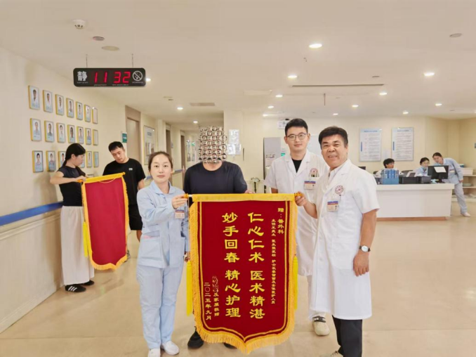 近日,济南南郊医院普外科上演了温馨感人的一幕:康复出院的张先生在家属的陪同下,将一面写有“仁心仁术 医术精湛 妙手回春 精心护理”金色大字的锦旗,郑重地交到普外科王兆太主任及医护人员手中。这张定格在医院走廊的合影,不仅记录下张先生重获新生的喜悦与感激,更无声诉说着两个多月前那场惊心动魄的生命救援。