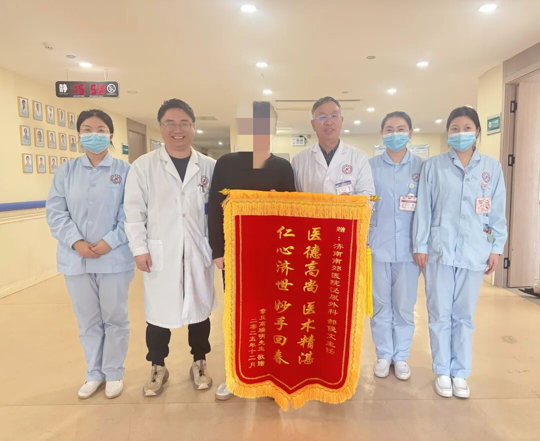 近日,在济南南郊医院泌尿外科发生了一件温馨感人的一幕。75岁的高大爷满面笑容,将一面绣着“医德高尚 医术精湛 仁心济世 妙手回春”的锦旗,郑重地送到郝俊文主任医师及科室医护人员手中,以此表达他深深的感激之情。