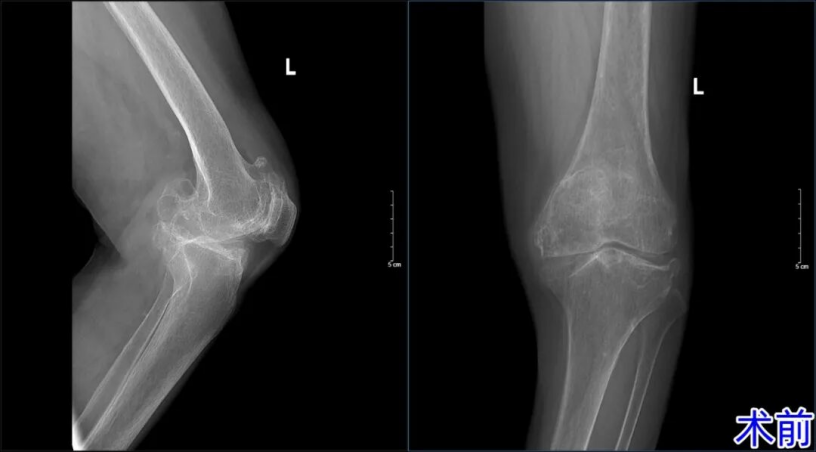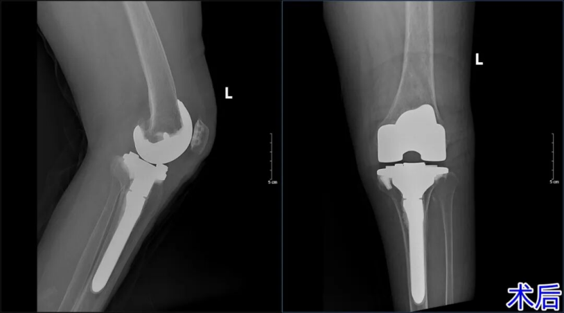 然而,左膝的隐患并未随之而去。随着疼痛日益加剧、关节严重变形,老人连基本的日常行走都举步维艰。“右腿好了,左腿绝不能拖后腿!”怀着对健康的渴望,王奶奶毫不犹豫地再次将信任交给了骨二科。面对左膝高达30°的内翻畸形、仅10°-100°的屈伸活动度,杨学良主任带领团队开启了新一轮的技术攻坚。从全面的心肺功能评估到假体的精确选型,从微创切口的设计到截骨角度的测算,每一个环节都精雕细琢,力求完美。