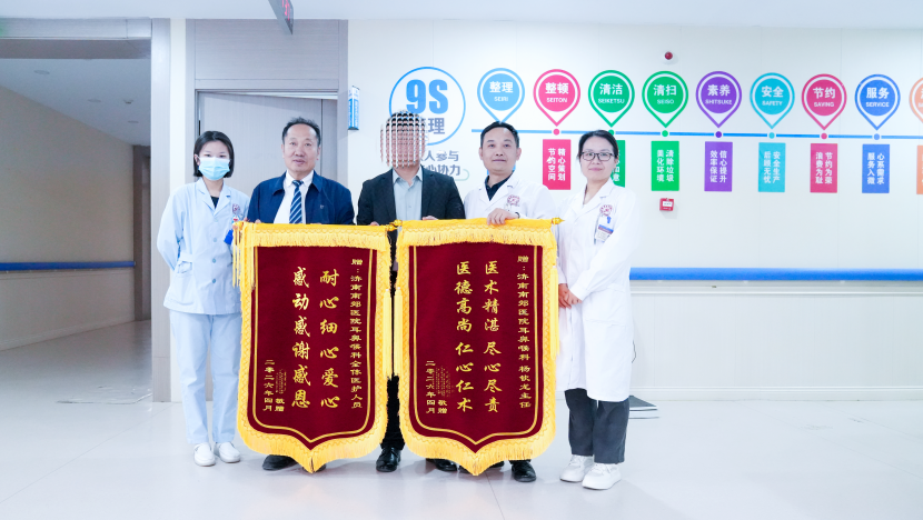 近日,在济南南郊医院耳鼻喉科,刚做完手术仅8天的一位打呼噜患者为杨钦龙主任团队送上锦旗。