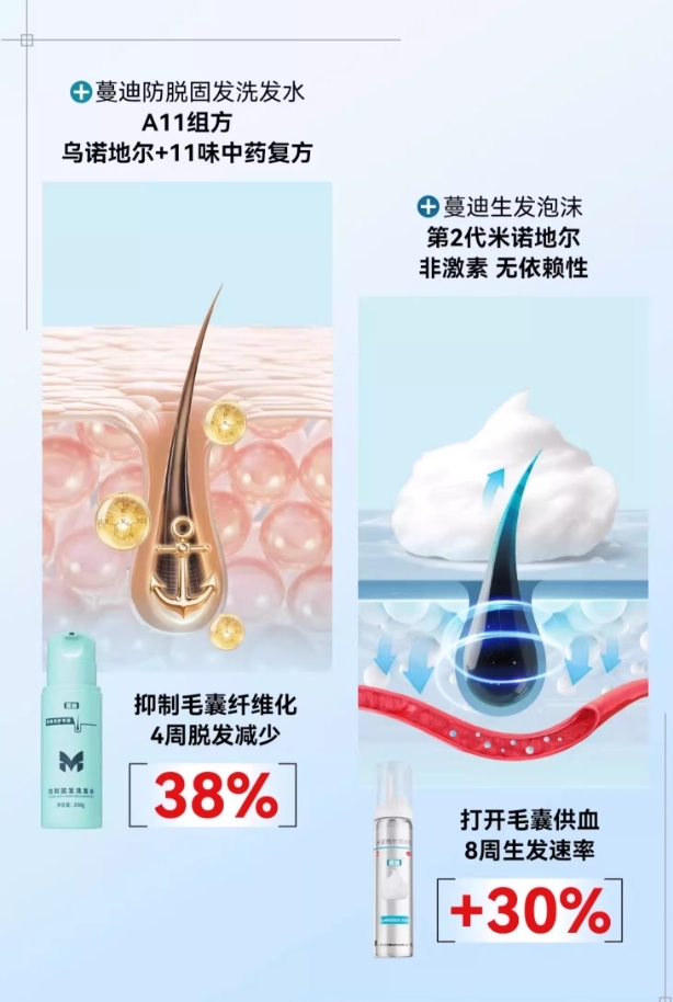 此外,蔓迪还构建了完善的防脱育发生态矩阵,在米诺地尔酊、泡沫剂、不同剂量装、二硫化硒洗发水、上药辅助工具等基础上,又推出 “米诺地尔泡沫剂 + 乌诺地尔防脱洗发水” 固生双效套装,从多场景、多维度为消费者提供了丰富的选择。