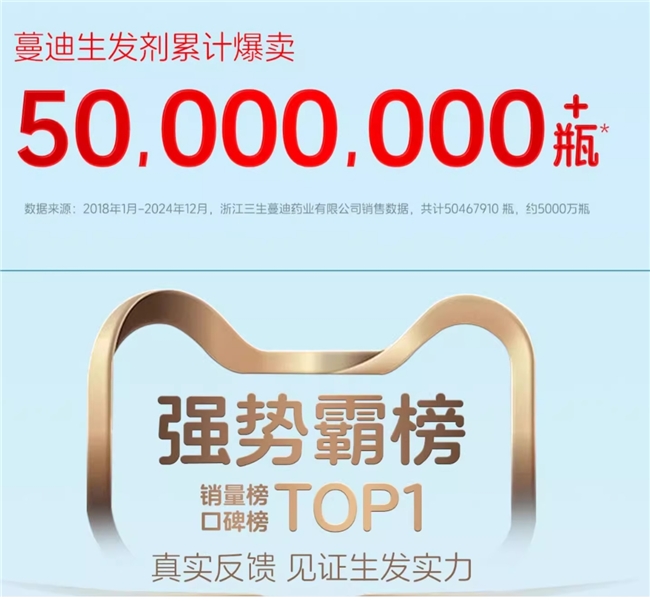 蔓迪隶属于上市药企三生制药旗下,是中国首个获批的米诺地尔制剂品牌,在国内米诺地尔市场占据重要地位。其产品覆盖全国 9 万家零售药店及 2000 家公立医疗机构,市场占有率超 70%,生发剂型累计销量突破 5000 万+瓶,是广受消费者认可的品牌之一。