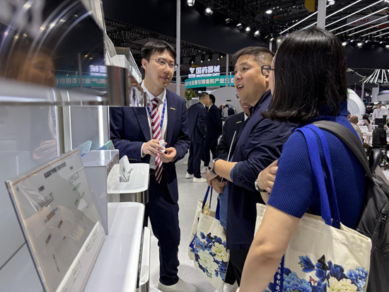 新华医疗工作人员在第93届CMEF现场为参观者进行讲解。